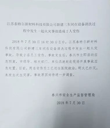 2018年7月30日16时30分左右,江苏泰转尔新材料科技有限公司新建三车间在设备清洗过程中发生一起火灾事故,导致2名员工受伤。事故发生后,泰兴市立即启动应急预案,市领导,相关部门、单位迅速赶赴现场开展事故应急处置。目前,两名受伤员工已送往医院教治。明火已补灭,米发生次生灾害,事故原因尚待进一步调查。