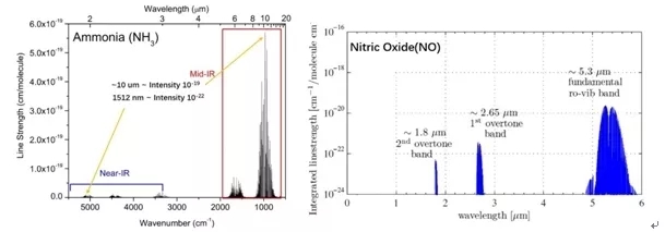 图4、NH3(左图)和NO(右图)的中红外吸收谱与近红外吸收谱强度的对比