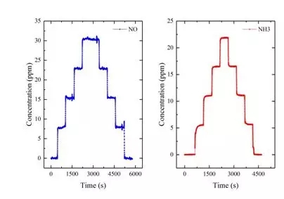 仪器采用全自动多点分布采样方案,可以有效测量每一采样点处的NH3和NOx含量,各点采样时间均匀,消除了人工采样的误差。激光测量法的样气预处理无需冷凝除水,由于内部没有活动部件,抗机械振动能力也远高于CEMS仪表,因此可以在脱硝出口空预器附近进行直接采样测量,无需进入分析小屋。准原位式的测量使得采样的滞后时间控制在十秒以内,提高喷氨反馈控制的实时性。为验证仪器性能,现场对仪表的氨和NOx测量功能进行,浓度阶梯测试,结果曲线如下图7所示: