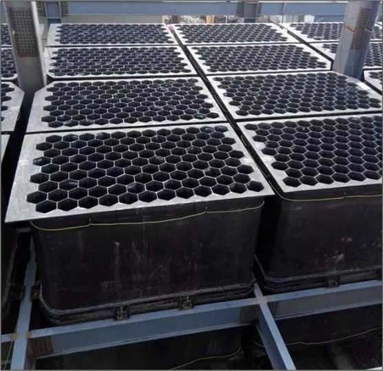 采用导电玻璃钢为阳极收尘,导电玻璃钢为整体式模块化布置,可以蜂窝状形式或板式形式。